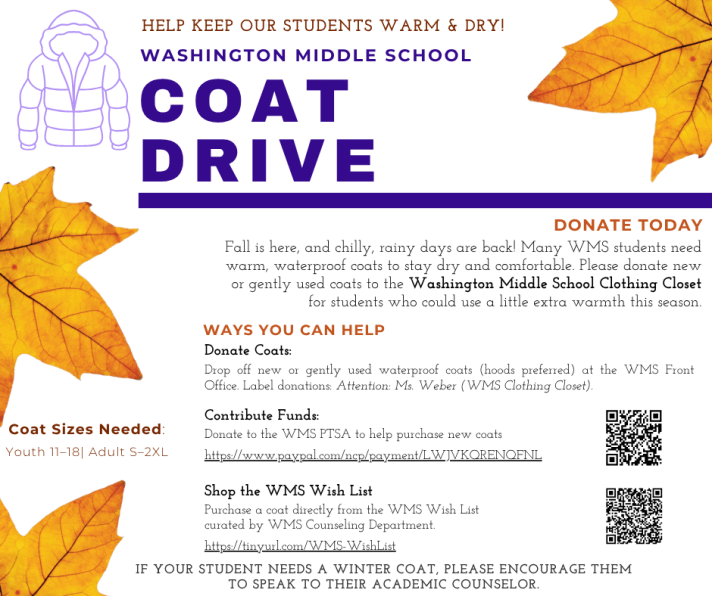 Fall is here, and we’re collecting new or gently used waterproof coats (with hoods preferred) for the Washington Middle School Clothing Closet. Your donations help ensure every student stays warm and comfortable this season.